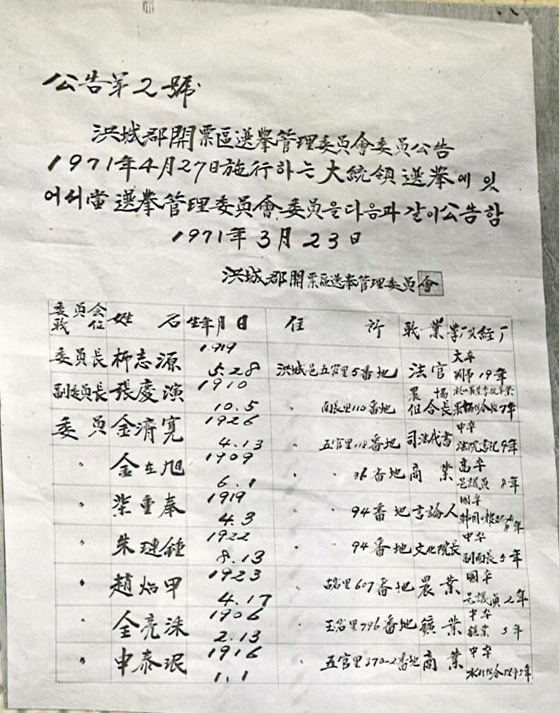 For the 7th presidential election, aside from Park, Chung-hee (Democratic Republican Party) and Kim, Dae-jung (New People’s Party), Jin, Bok-gi (Justice Party), Park, Ki-chool (National Party), Lee, Jong-yoon (Free Democratic Party), Sung, Bo-kyung (Populist Party), and Kim, Chul (Socialist Unity Party) also ran for president. Sung, Bo-kyung and Kim, chul, however, resigned from the race in the middle of the election. The main competition was on between Park, Chung-hee, the incumbent president who tried for a third term, and Kim, Dae-jung, who insisted on stopping the incumbent’s third term and replacing the current government.