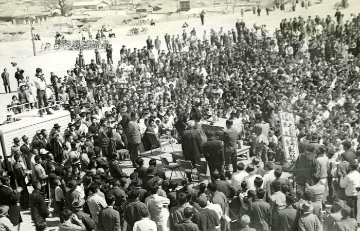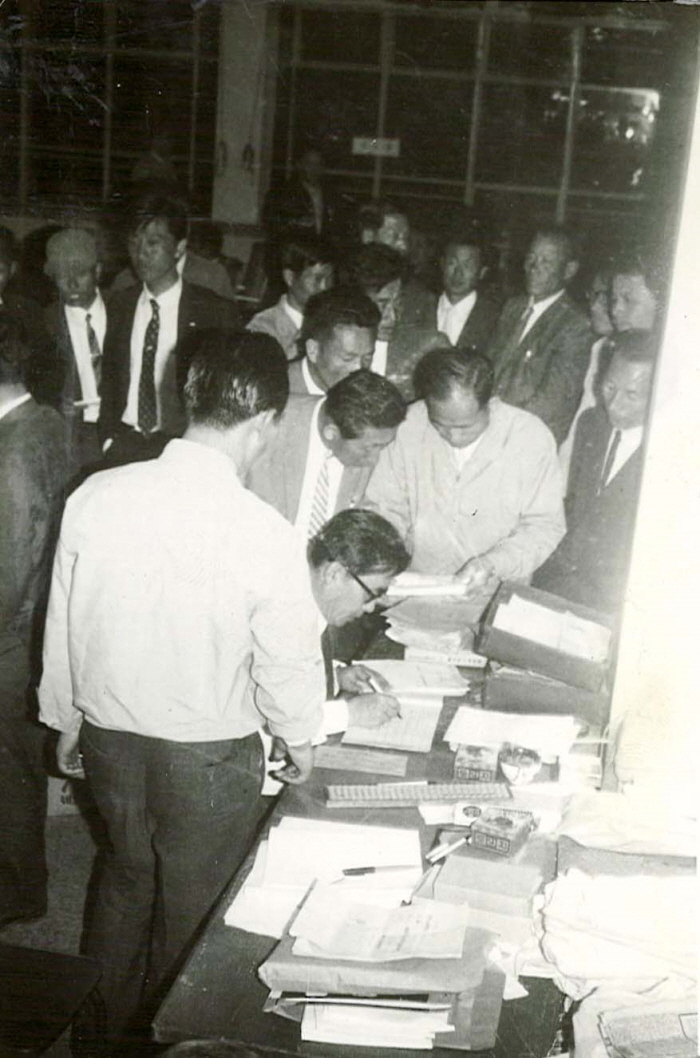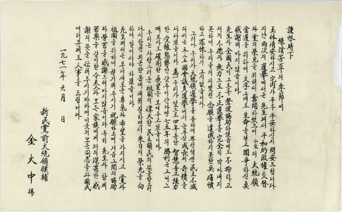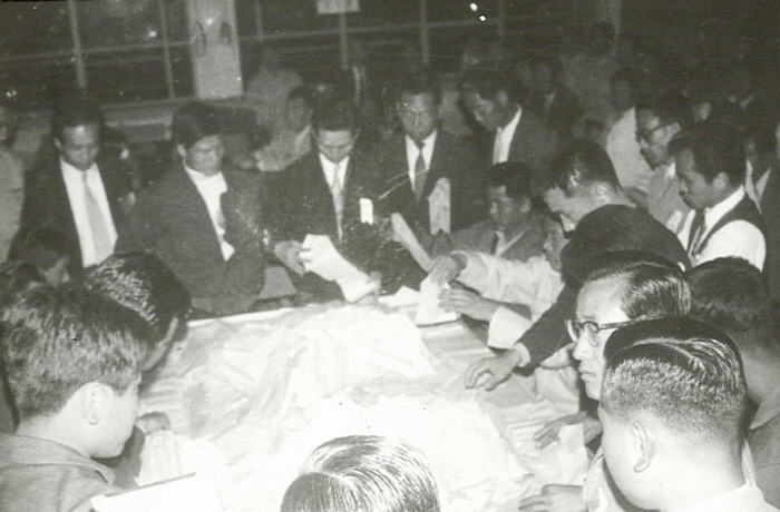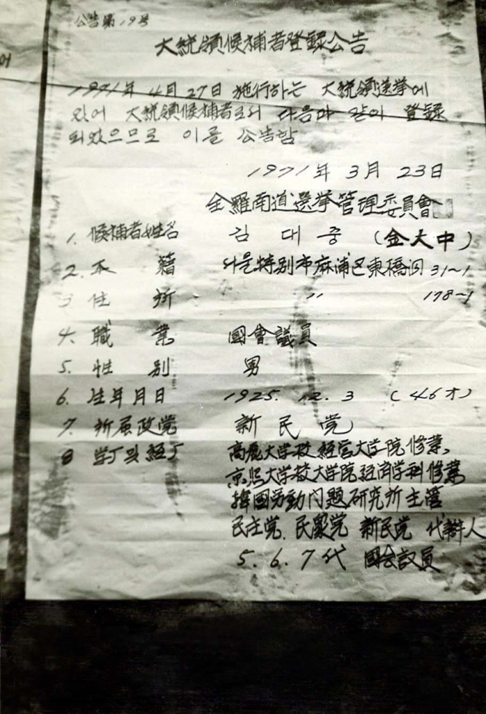 The constitutional amendment bill on legalizing three consecutive terms of presidential service was passed by referendum on October 21, 1969. The 7th presidential election was held on April 27, 1971, and Park, Chung-hee ran for president again. With a call for a shift in generations inside the New People’s Party, the leading opposition party, driven by the slogan: “Time to See Leadership in their 40s” proposed by Kim, Young-sam, three people within the party competed for candidacy: Kim, Young-sam, Kim, Dae-jung and Lee, Chul-seung. Kim, Dae-jung was nominated as the candidate in the end.