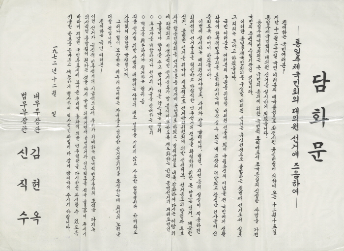 On October 17, 1972, President Park, Chung-hee dissolved the National Assembly and suspended the political parties and their activities by declaring a state of emergency through a special statement. He also suspended some provisions of the Constitution and led the Emergency Cabinet Council to handle the work of the National Assembly by proxy. Since then, martial law was declared. Under such circumstances, the Emergency Cabinet Council proclaimed a constitutional amendment on October 26, 1972. And the so-called “Reform Constitution,” called “Yushin Constitution” in Korean, was confirmed on November 21 by referendum with 91.5% of yes votes.