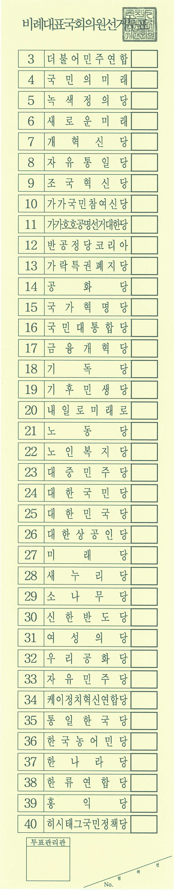 후보자등록 마감 결과 지역구 국회의원선거는 21개 정당 및 무소속에서 693명, 비례대표 국회의원선거는 38개 정당에서 245명이 등록하였다. 이번 비례대표 선거 투표용지 길이는 51.7㎝로 역대 최장을 기록하였다.