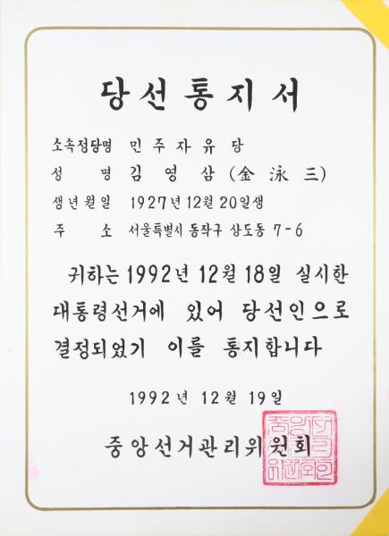 제14대 대통령선거 김영삼 당선통지서