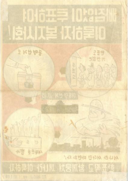 하단에는 “한표찍고 함께뭉쳐 새나라 이룩하자”라는 문구를 통해 선거 참여가 국가 발전과 새로운 사회 건설로 이어진다는 메시지를 강조하고 있다. 또한 ‘주간 새나라사 발행(105호 부록)’이라는 문구를 통해 제작 및 배포된 곳의 출처를 확인할 수 있다. 결국 포스터가 전하려 한 메시지는 새로운 지도자를 선출하고 경제 발전과 근대화를 통한 복지사회를 이루기 위해서는 선거에 참여해야 한다는 것이었다.