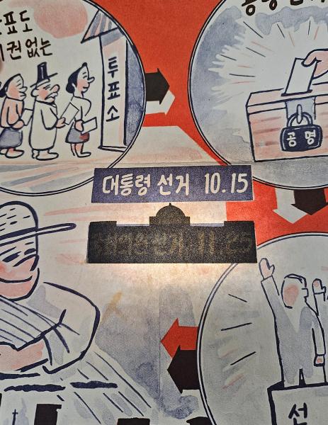 그림의 중앙 부분에 ‘대통령선거 10.15’ 라는 문구가 박스 형태로 강조되어 있는데, 이를 통해 1963년에 치러진 제5대 대통령선거라는 것을 확인할 수 있다. 그 아래에는 당시 정부청사 윤곽을 검게 그려넣었는데, 자세히 살펴보면 ‘국회의원선거 11.25’ 라는 글자가 가려져 있음을 알 수 있다. 재미있는 부분은 1963년에는 10월 15일에 제5대 대통령선거와 11월 26일에 제6대 국회의원선거가 치러졌었다. 당시 같은 해에 치러지는 두 선거의 시기가 비슷하여 하나의 포스터로 두 선거를 동시에 홍보하려 했던 것으로 보인다. 그러나 국회의원선거 날짜가 잘못 표기되는 실수가 발생하여 이를 가리기 위해 당시 정부청사 건물의 실루엣을 그 위에 덧그린 것으로 판단된다.