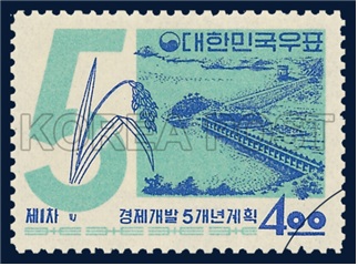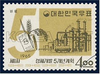 네번째 그림은 농민의 모습을 도시의 실루엣과 함께 배치하고 ‘새나라 새터전 마련하자!’라는 문구가 작성되어 있다. 농부와 공장의 이미지를 함께 배치한 구성은 전통적 농업과 근대적 공업이 함께 발전하는 당시 국가 발전 정책을 시각적으로 상징하는 표현으로 볼 수 있다. [사진3]은 1965년에 제작된 우표로, 포스터와 마찬가지로 벼이삭과 공장시설, 산업 설비 등이 함께 표현되어 있다.